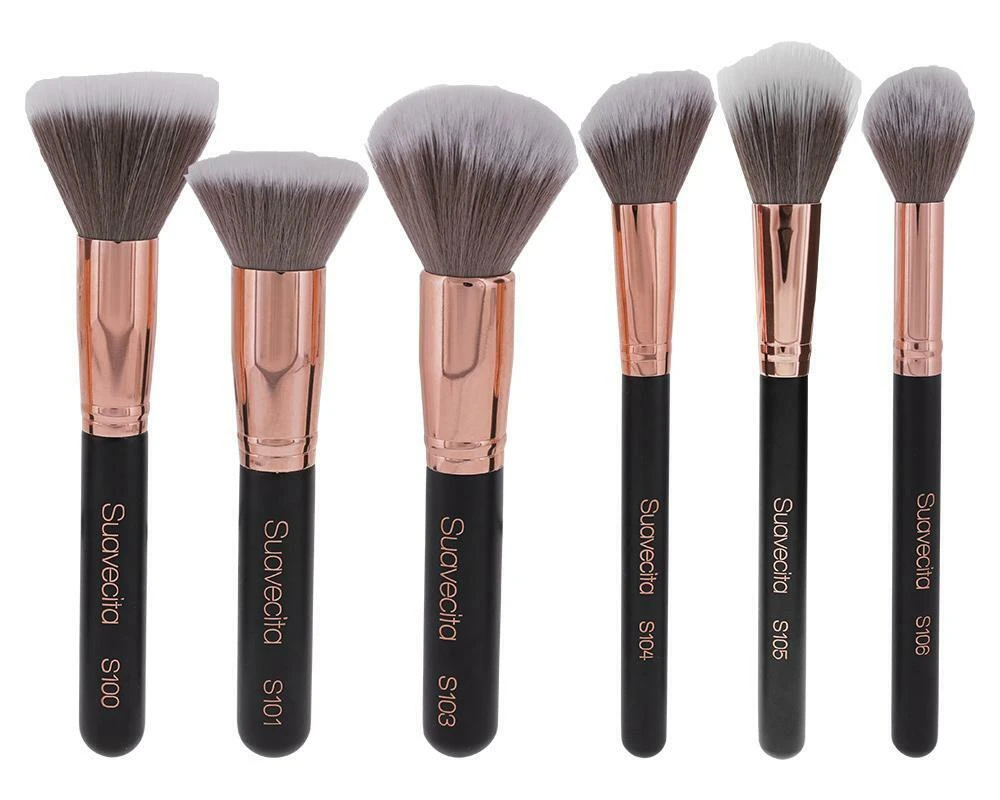 The Suavecita Face Brush Set includes six deluxe tools ideal for all over face makeup. Use the duo-fiber brushes for liquid or cream products and the flat, domed and angled brushes for powder products. Each brush is uniquely designed to disperse product evenly and flawlessly. All of our brushes are vegan and cruelty-free.Â