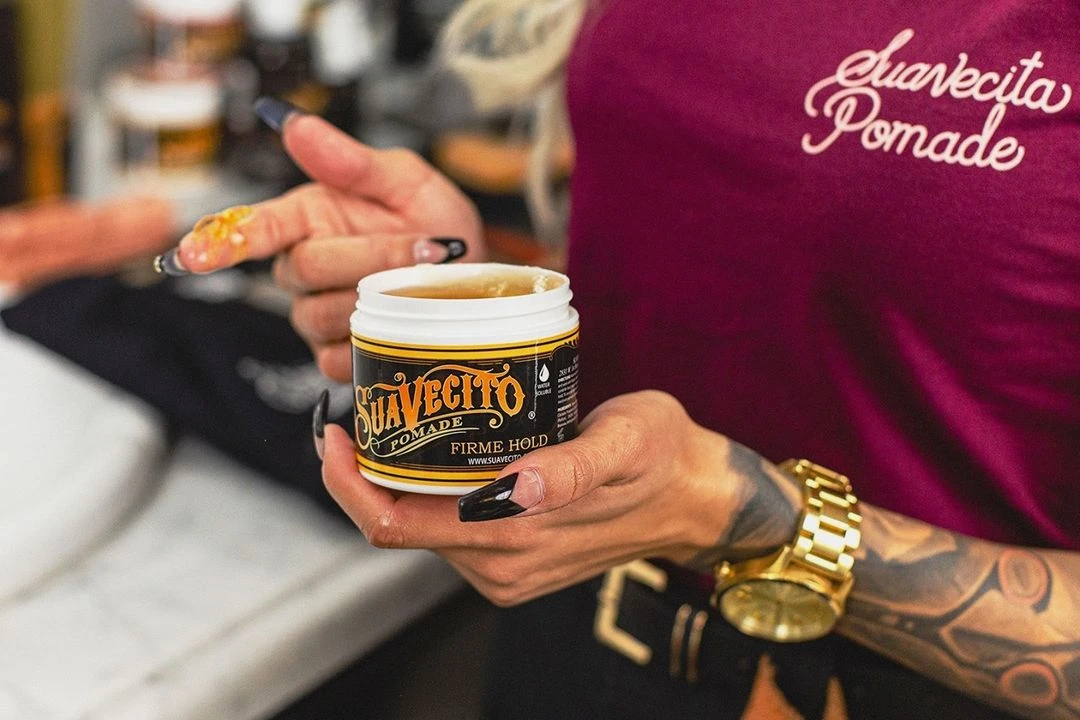 Taking Suavecito’s Original Hold pomade formula and kicking it up a notch, Suavecito’s Firme Hold Pomade is an extra strength hair styling pomade. For those days your hair needs a little extra ‘help’, this water soluble pomade will tame anything you throw at it. This formula works great for curly, thick or stubborn hair. Pompadours, slick backs and side parts can be styled with ease. Strong and tough but still combs in with ease. With the same awesome base ingredients and scent as our original, this pomade washes out easily and doesn’t flake. No need for any special soaps or shampoos. It dries with a high firmness and medium shine.