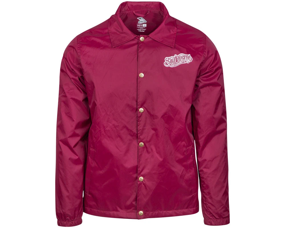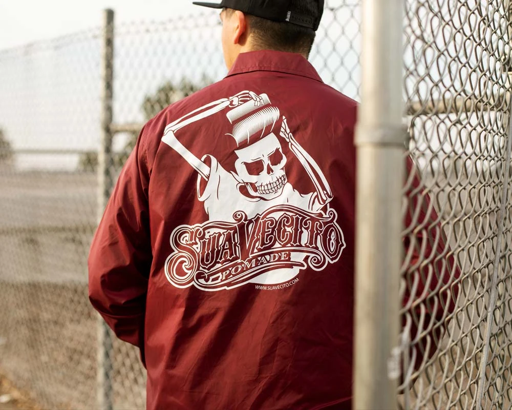 The perfect jacket to keep with you in your car or backpack. The OG Windbreaker in burgundy is lightweight and compact, but has a soft lining to keep you toasty. Featuring our OG script on the front, skeleton logo on the back, and custom Suavecito snaps, you’ll be reppin your favorite pomade brand in this jacket.