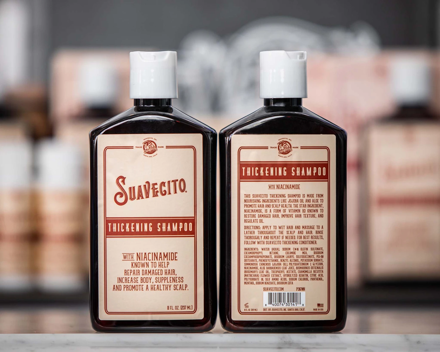 Our Thickening Shampoo contains niacinamide as well as other ingredients that are popular in hair loss shampoos for their hair growth benefits. Rosemary oil has been commonly used to promote hair growth similar to minoxidil. Panthenol is believed to have benefits for hair thickness and moisture retention. Aloe Barbadensis Leaf Juice aloe may help promote a healthy scalp and help condition and repair damaged hair, keeping your follicles clean and healthy.Â
